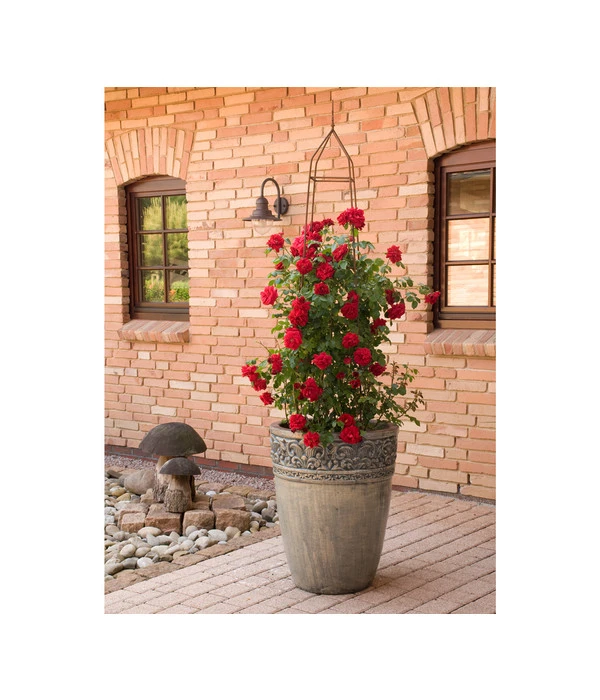 Kein Wunder, dass manche Rosen-Liebhaber ein leuchtendes Blutrot als die schönste Rosenfarbe empfinden. Und obwohl es natürlich viele schöne Blütenfarben bei Rosen gibt, ist man beim Anblick der Kletterrose ‚Amadeus®‘ geneigt, sofort und vorbehaltlos zuzustimmen. Eine prächtige, blutrote, halbgefüllte Rosenblüte strahlt neben der anderen – die Fernwirkung dieser Rose ist einzigartig! Und dazu liegt ein dezenter Wildrosenduft in der Luft, der zum Träumen verführt. Die außergewöhnliche Wirkung der Kletterrose ‚Amadeus®‘ wird auch unterstützt durch das dunkelgrüne, dichte und stark glänzende Laub. Die Gartenpflanze überzeugt mit einem gesunden, kräftigen Wuchs und erreicht je nach Standort und Klimaregion eine Höhe von maximal 2,5 m. Die öfter blühende Rose ‚Amadeus®‘ erfreut den Gärtner auch durch ihre besondere Robustheit: Sowohl bei Mehltau als auch bei Sternrußtau zeigt sie kaum Befall. Kein Wunder, dass diese Rosenkönigin bereits mehrere Auszeichnungen erhalten hat, unter anderem 2004 die Goldmedaille in Den Haag und in Genf.