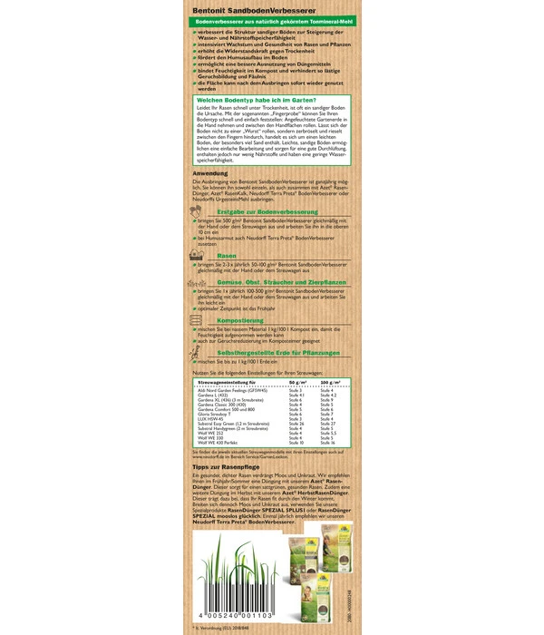 Eine gute Nachricht für alle, die einen sandigen Boden im Garten haben, mit dem viele Pflanzen nicht wirklich glücklich sind: Mit dem Bentonit SandbodenVerbesserer von Neudorff können Sie Ihren Gartenboden schnell und unkompliziert pflanzenverträglicher machen. Dieser spezielle Bodenhilfsstoff besteht aus natürlichem, gekörntem Tonmineralmehl. Damit verbessern Sie nachhaltig die Struktur leichter und sandiger Böden und erhöhen die Speicherfähigkeit von Wasser und anderen lebensnotwenigen Nährstoffen. Auch Dünger kann in einem sandigen Boden besser wirken, wenn dieser zuvor mit Neudorff Bentonit SandbodenVerbesserer behandelt wurde. Der Hilfsstoff ermöglicht den Aufbau stabiler Ton-Humus-Komplexe, gibt dem Boden eine krümelige Struktur, die sich gut bearbeiten lässt und in denen Pflanzen gut Fuß fassen können. Ärgern Sie sich nicht länger über schwaches Pflanzenwachstum in Ihrem Garten und lassen Sie noch heute den Neudorff Bentonit SandbodenVerbesserer seine wohltuende Wirkung entfalten. Und erleben Sie dann voller Stolz, wie sich Ihr Garten in eine prächtige, grüne Oase verwandelt.