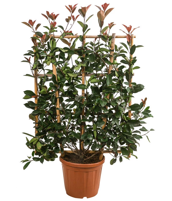 Immergrüne Laubgehölze sind ohne Frage wichtige Elemente in der ganzjährig attraktiven Gartengestaltung. Mit der Purpur-Glanzmispel ‚Red Robin‘ aber können wir Ihnen eine immergrüne Pflanze vorstellen, die sich nicht mit einem glänzenden, dunkelgrünen Laubkleid zufrieden gibt, sondern sich im Frühling mit einem leuchtend roten Blattaustrieb in Szene setzt. Während die neuen Blätter über den Sommer vergrünen, schmückt sich Photinia fraseri im Mai/Juni außerdem mit duftigen, weißen Schirmblüten, aus denen sich bis zum Spätsommer erbsengroße, rote Früchte entwickeln, die gerne von Wildvögeln genascht werden. Eine Besonderheit der Purpur-Glanzmispel ‚Red Robin‘, die wir Ihnen hier anbieten: Die Pflanze wurde am Spalier gezogen, sodass sie nur eine geringe Tiefe hat. Auf diese Weise eignet sie sich perfekt als Heckenpflanze auch für kleinere Gärten oder als Sichtschutz neben der Terrasse. Holen Sie sich gleich diese Purpur-Glanzmispel ‚Red Robin‘ am Spalier und freuen sich schon auf das dekorative Farbschauspiel im Jahresverlauf!
